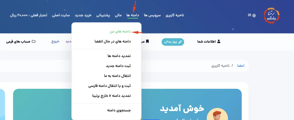 2 – از سربرگ “دامنه ها” بر روی “دامین های من” کلیک نمایید، تا لیست دامنه های شما نمایش داده شود: