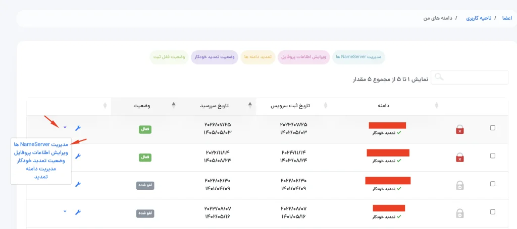 3 – دامنه مورد نظر را یافته و روی دکمه “مدیریت دامنه” در مقابل آن کلیک کنید.